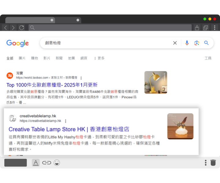 在此次合作中,Daycatch为Creative Table Lamp Store HK提供了高效搜索引擎优化策略,精准聚焦“创意枱燈”、“枱燈”等关键词。通过深入市场和用户搜索行为分析,仅用三个月,我们将“创意枱燈”推至搜索首页第2位,成为客户首选。